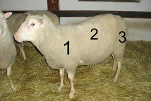 Bilden visar de ställen (1, 2 och 3) där man bedömer finleksklassen och stapellängden samt tar ullprover.